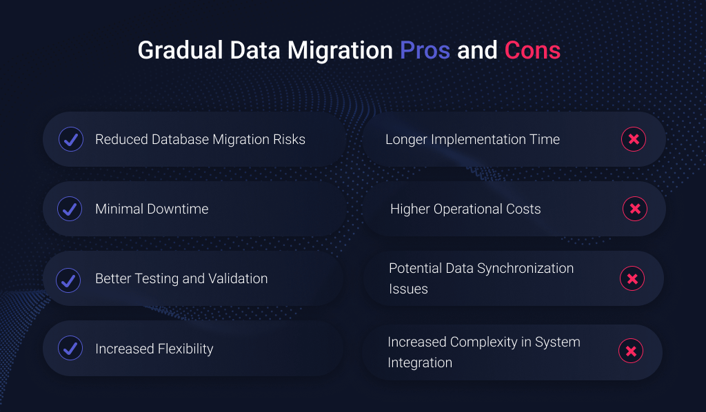 Big Bang migrations usually require one large downtime window that impacts all systems at once. Even though this major disruption can be planned during times of low activity such as weekends or holidays, it still means a total service outage. The benefit is that users only go through one significant change, and after that, they work entirely in the new environment.